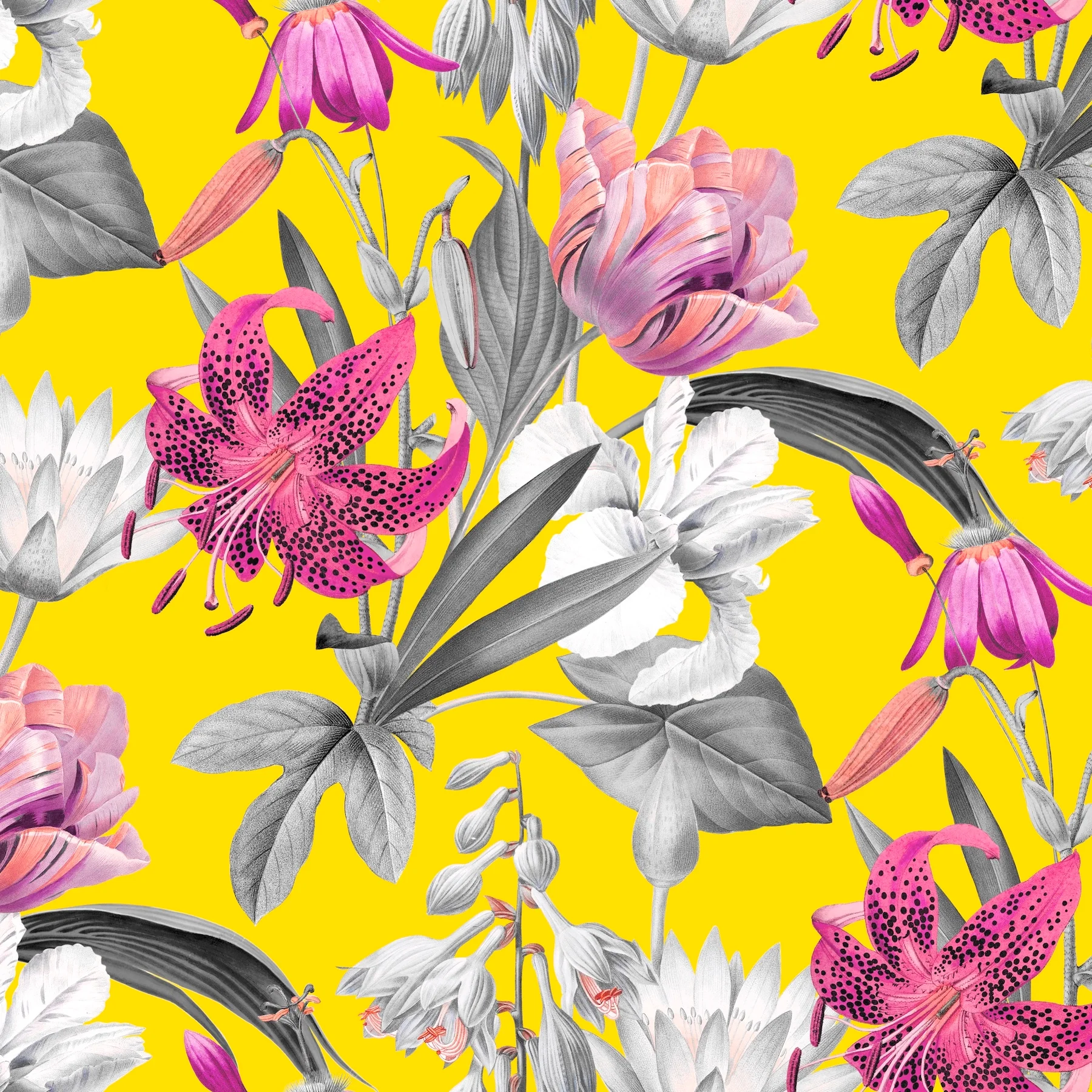 - Exotic Floral Swimwear Print – Vibrant tropical flowers on a bold yellow background.